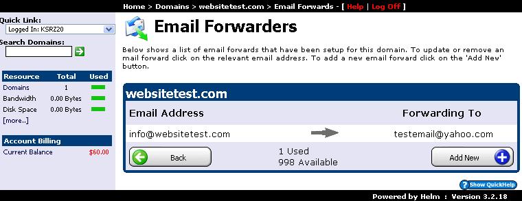 4) If you have not yet added an email forwarder then the next window will appear blank as you see in the picture below. If you already added an email forwarder so far then this window will display that email and you can click on it to change his settings. We will add a new address so click on "Add New":